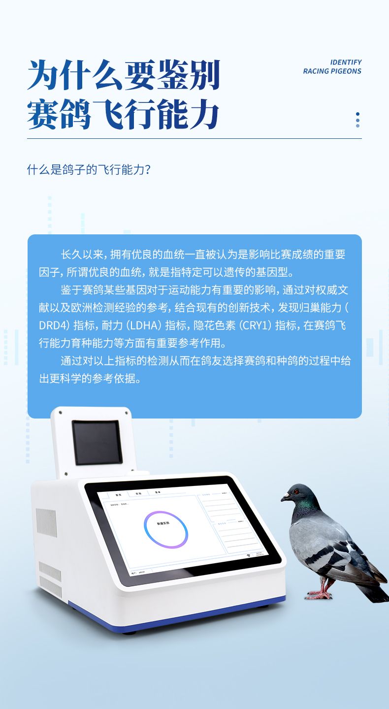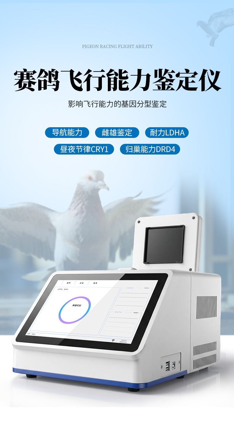 我司結合上述基因研究推出的鴿子飛行能力鑒定儀可同時鑒定包含鴿子雌雄性別及歸巢能力DRD4、飛行耐力LDHA、導航能力、晝夜節律CRY1、肌力(肌肉調控)MSTN、羽翼(羽毛結構和強度)F-KER、智力CASK和陰雨天定向GSR等影響飛行能力的基因分型鑒定。