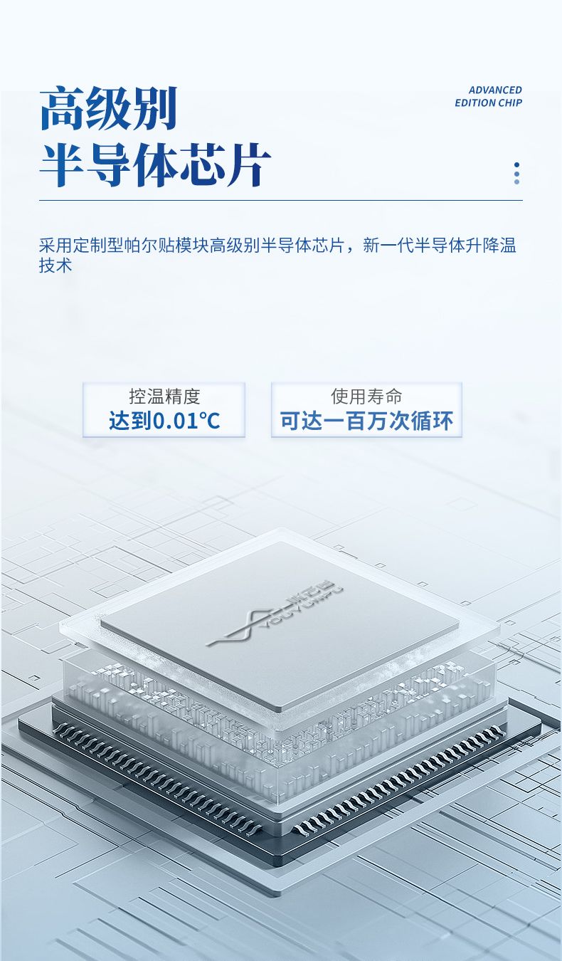 2、采用美國MARLOW定制型帕爾貼模塊高級別半導體芯片,新一代半導體升降溫技術,最快變溫速率可達每秒7度,使用壽命可達一百萬次循環;