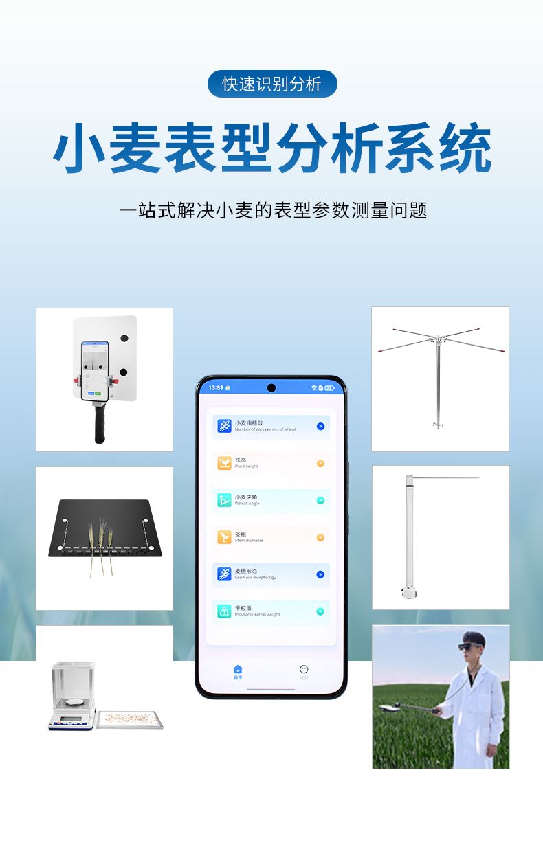 4)麥穗形態(tài)測定儀依托手機視覺技術(shù),通過AI圖像矯正算法一鍵獲取穗長、小穗數(shù)等關(guān)鍵指標(biāo)。全系統(tǒng)實現(xiàn)田間快速取樣、批量分析及數(shù)據(jù)互聯(lián),為育種優(yōu)化、產(chǎn)量預(yù)測和功能基因解析提供智能化解決方案。