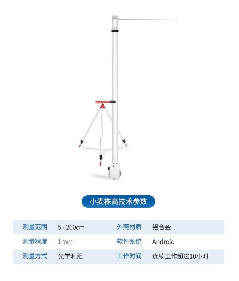 小麥株高測量儀是專為農(nóng)業(yè)領(lǐng)域設(shè)計的一種便攜式、快速響應(yīng)的農(nóng)作物高度測量工具。采用內(nèi)置光學(xué)測距技術(shù),并通過內(nèi)置算法進(jìn)行現(xiàn)場分析,能夠?qū)崟r獲取高度數(shù)據(jù)。