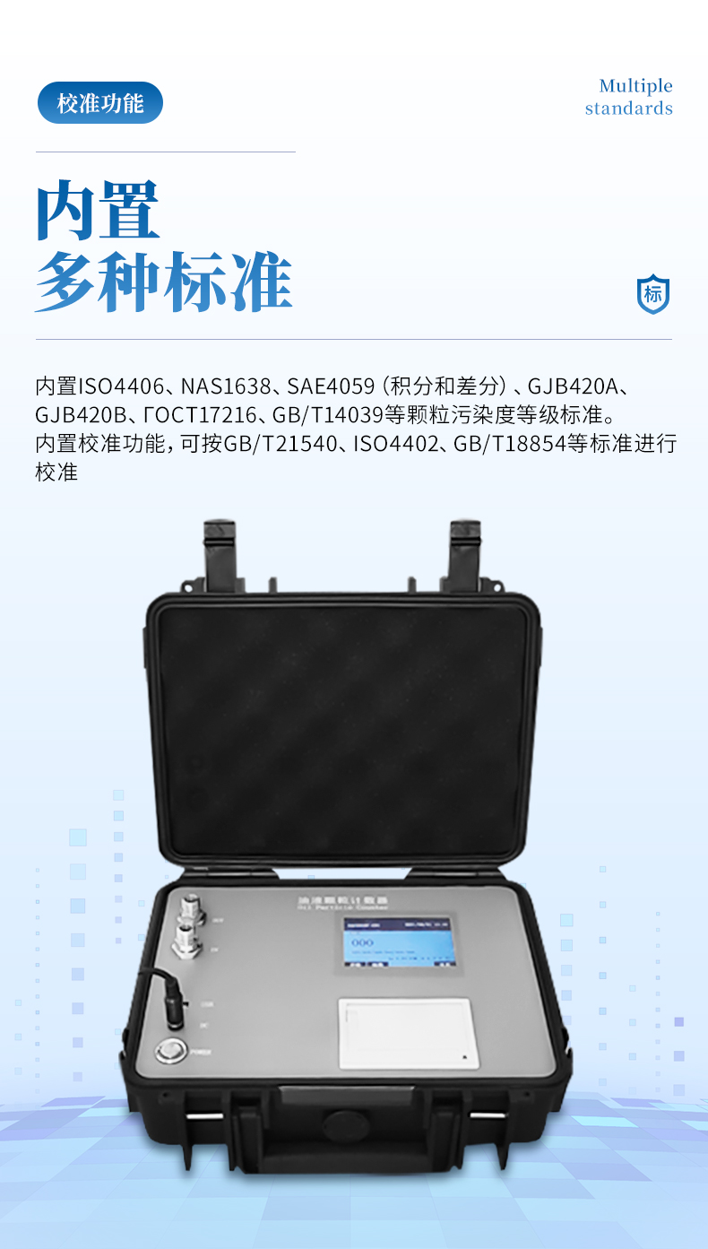 ■內(nèi)置GJB-420A、GJB-420B、SAE4059E、ISO4406、GB/T14039、NAS1638和ГOST17216等常用標(biāo)準(zhǔn),支持自定義標(biāo)準(zhǔn)測(cè)試,并可根據(jù)客戶(hù)需求設(shè)置所需標(biāo)準(zhǔn)
