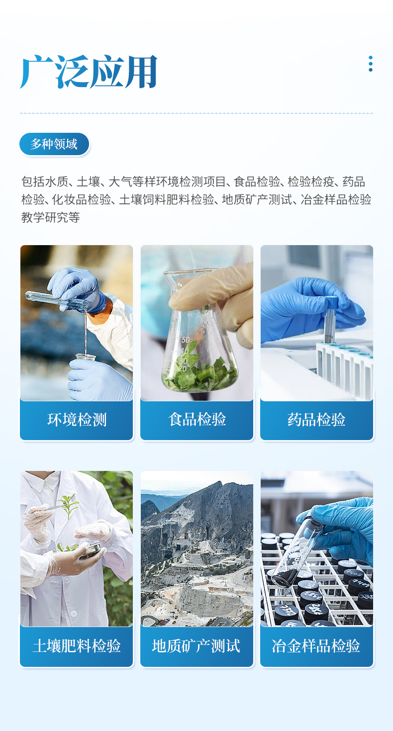 原子熒光光譜儀的應用領域較為廣泛,主要測試樣品中 11 種超痕量元素的含量,最低檢測下限可達千億分之一級。應用領域包括水質、土壤、大氣等樣環境檢測項目、食品檢驗、檢驗檢疫、藥品檢驗、化妝品檢驗、土壤飼料肥料檢驗、地質礦產測試、冶金樣品檢驗、教學研究等。