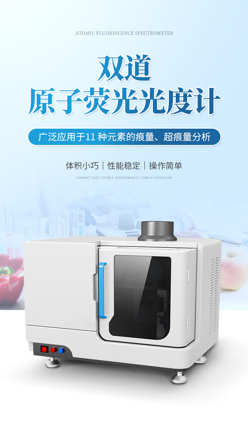 雙道原子熒光光譜儀廣泛應用于汞(Hg)、砷(As)、銻(Sb)、鉍(Bi)、硒(Se)、碲(Te)、鎘(Cd)、鍺(Ge)、鉛(Pb)、錫(Sn)、鋅(Zn)等11 種元素的痕量、超痕量分析,體積小巧,性能穩定,操作簡單。