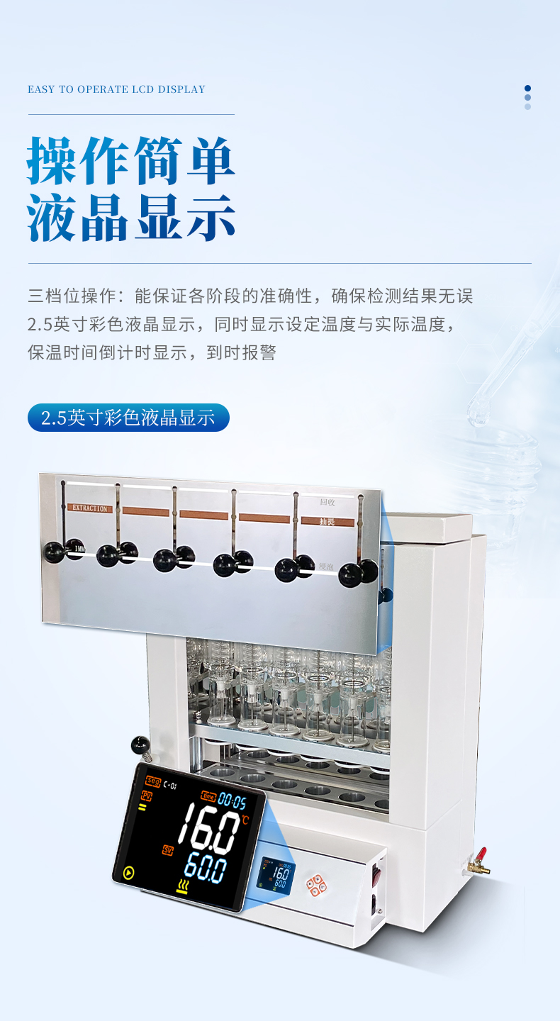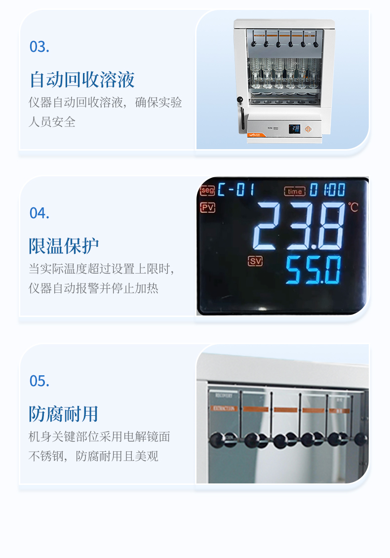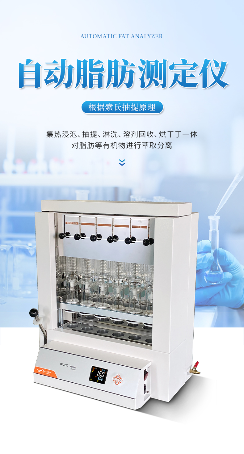 自動脂肪測定儀(索氏提取儀)是根據(jù)索氏抽提原理,集熱浸泡、抽提、 淋洗、溶劑回收、烘干于一體,對脂肪等有機物進行萃取分離的儀器。儀器采用了自 動控溫、全封閉井式電加熱形式,使儀器加溫更為均勻,安全可靠,并具有良好的密 封設(shè)施,從而達到快速準(zhǔn)確的目的;最大限度降低溶劑用量,自動回收溶劑,節(jié)省分 析成本。具有設(shè)計合理、操作簡單、精確度高、性能穩(wěn)定、重現(xiàn)性 好、省力、省時等優(yōu)點。