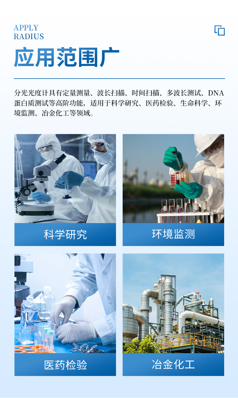 分光光度計具有定量測量、波長掃描、時間掃描、多波長測試、DNA蛋白質測試等高階功能,具有高精度、高分辨率、低噪聲、低雜散光的特點,特別適用于科學研究、醫藥檢驗、生命科學、環境監測、冶金化工等領域。